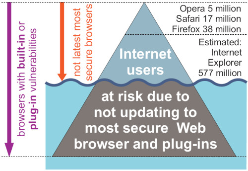 637 million Users Vulnerable to AttackPosted by Gunter Ollmann on July 01, 2008 at 8:20 AM EDT. You can sum up a lot in a single number. 637 million. That’s the approximate number of users currently surfing the Web on a daily basis with an out-of-date browser – i.e. not running a current, fully patched Web browser version – or, to put it another way, 45.2 percent of all Internet surfers have neglected to update their favorite Web browser and are potentially vulnerable to all sorts of nastiness. If you think that that’s a big number, wait until you start factoring in Web browser plug-ins also missing their latest security patches. Since the beginning of the year we’ve all been reading about the monthly barrage of 100,000+ or 1,000,000+ mass-defacements with injected malicious iframes (in fact I’ve written about a few of them on this very blog), but have you ever wondered how many hosts could be infected by the product of these defacements? – i.e. if an attacker seeded enough Web sites around the globe with Web browser exploit material, how many users would likely find their host infected with some malicious backdoor, Trojan or bot-agent? Well, with the help of some good friends over at ETH Zurich and Google – Stefan Frei, Thomas Duebendorfer and Martin May (and the kind permission of Google management) – I was lucky enough to work with them in analyzing the daily USER-AGENT data collected by Google’s Web search and application servers around the world, and managing to study how users patch and update their Web browsers. From that, we were able to work out just how many users are taking their systems integrity in their hands as they browse an increasingly dangerous Internet – 637 million in June – and that was just the tip of the iceberg. While the full whitepaper and our analysis can be found over here, I thought I’d point out a few of the more interesting security points in the meantime… (1) I think that most people would agree that Google’s visibility of the Internet is unmatched, with an estimated 75 percent or all Web searches done through their engine. That meant we had fabulous global coverage of Web browser usage. And, before you ask, no – we didn’t have access to any personally identifiable information – but CO2 emissions were kept to a minimum and no small furry animals suffered any distress at our hands while writing the whitepaper. As a result, we counted some 637 million users as using out-of-date Web browsers and potentially vulnerable to popular drive-by-download attack vectors and exploits.