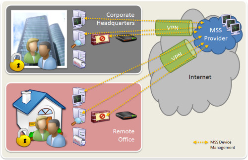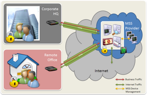 Rather than the client organization hosting the protection appliances and technologies at the perimeter of their enterprise (as well as every remote office location), the same protection technologies are effectively transplanted to the MSS services operation “in-the-cloud”. All outbound office traffic passes through a secure VPN (or equivalent secure pipe) directly the MSS providers in-the-cloud protection framework (The network traffic can't go anywhere else). The management portals with their configuration and reporting options all look the same, and effectively the client organization notices no difference in service delivery capabilities. Enablement The provision of “in-the-cloud” protection will have a number of critical advantages: