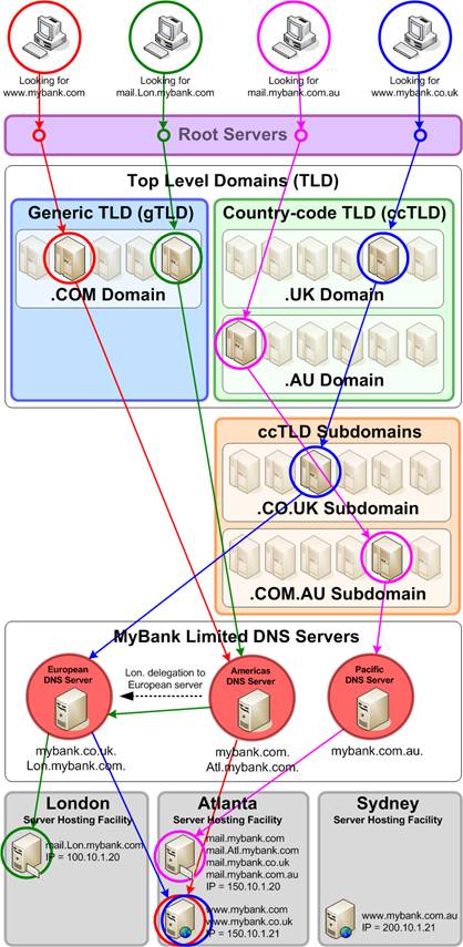 Firstly the user’s computer will require a DNS resolver to connect to a known root server (sometimes referred to as “.” (dot) servers) and obtain the details of a server that knows about .com. addresses.  The root server will thus provide details of an appropriate Top Level Domain (TLD) server, which is then queried by the DNS resolver for details about the authoritative .mybank.com. address.  Finally, the resolver queries the organisations authoritative DNS server for the IP address of the “www” host (full name www.mybank.com), and the user can then use this IP information to connect to the web banking host.